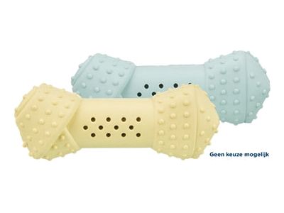 Het Trixie Junior Koelbot Natuurrubber Assorti van 10 cm is hondenspeelgoed dat water opneemt of ingevroren kan worden voor lekkere verkoeling voor jouw pup! Het bot is gemaakt van natuurrubber. Er zijn kleine gaatjes in het middenstuk gemaakt, die water opnemen bij onderdompeling. Wanneer de pup op het botje kauwt, ontsnapt het water via de kleine gaatjes. Voor een extra fris-kick en langer spelen kun je het gehele bot met water invriezen: zo doet de hond er langer over het ijs te laten smelten en het water uit het bot te krijgen!